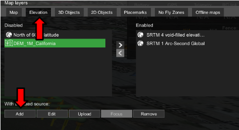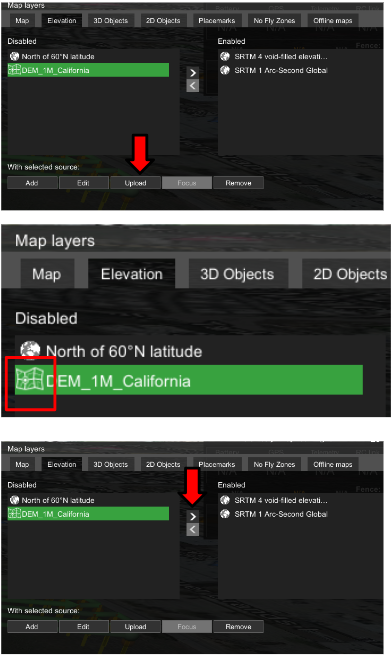 Then select **Upload** to load your .tiff elevation data file. The map icon will appear filled in when the data has finished loading, you will also see on the UgCS Map view the terrain turn green when viewing the enabled elevation data source.