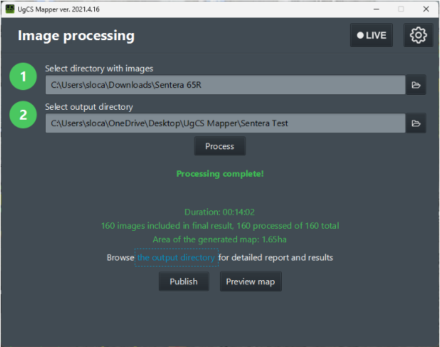 **Select your image database and output directory**, then when processing is complete you will have .tiff files for orthophoto and terrain.