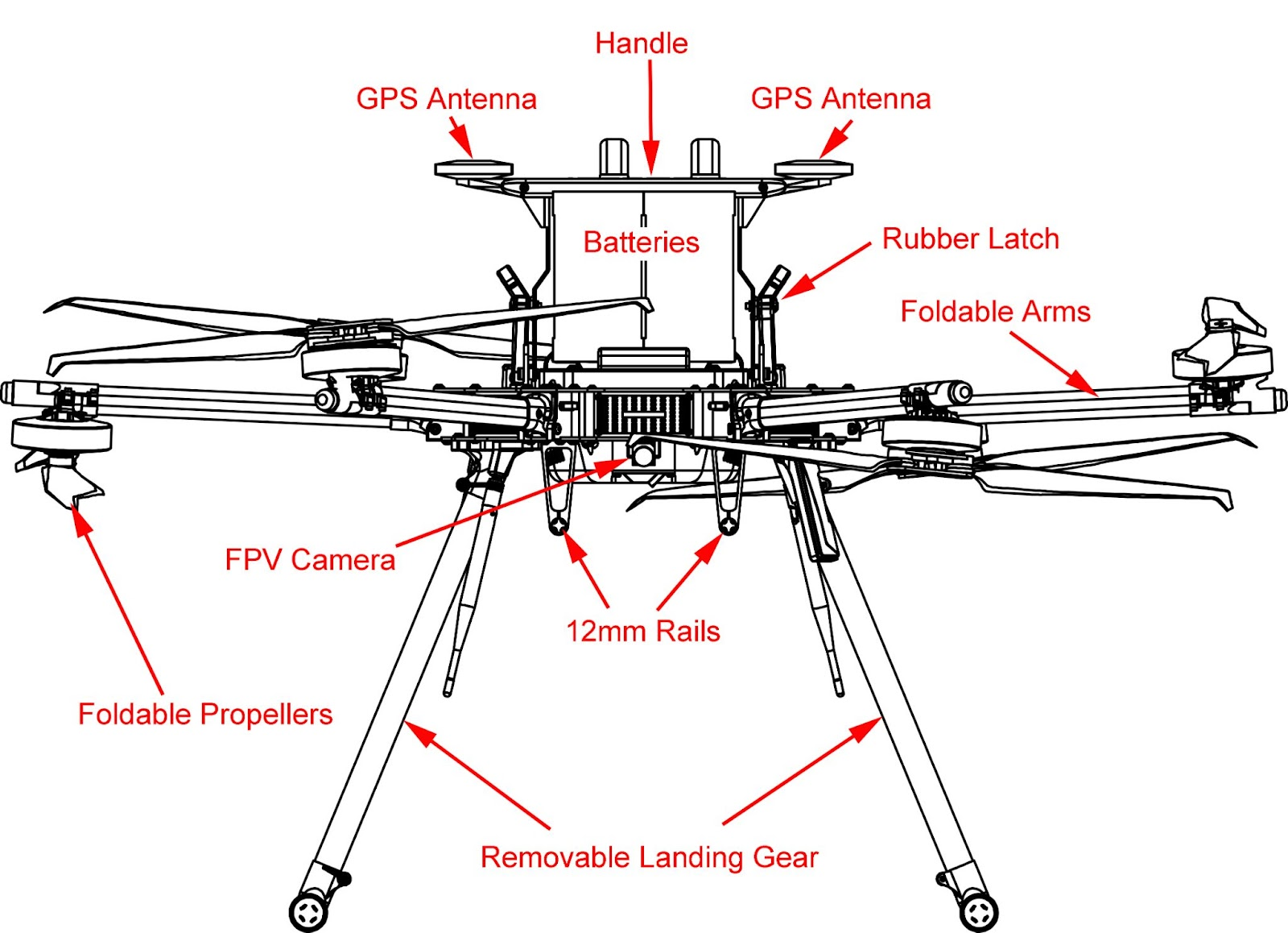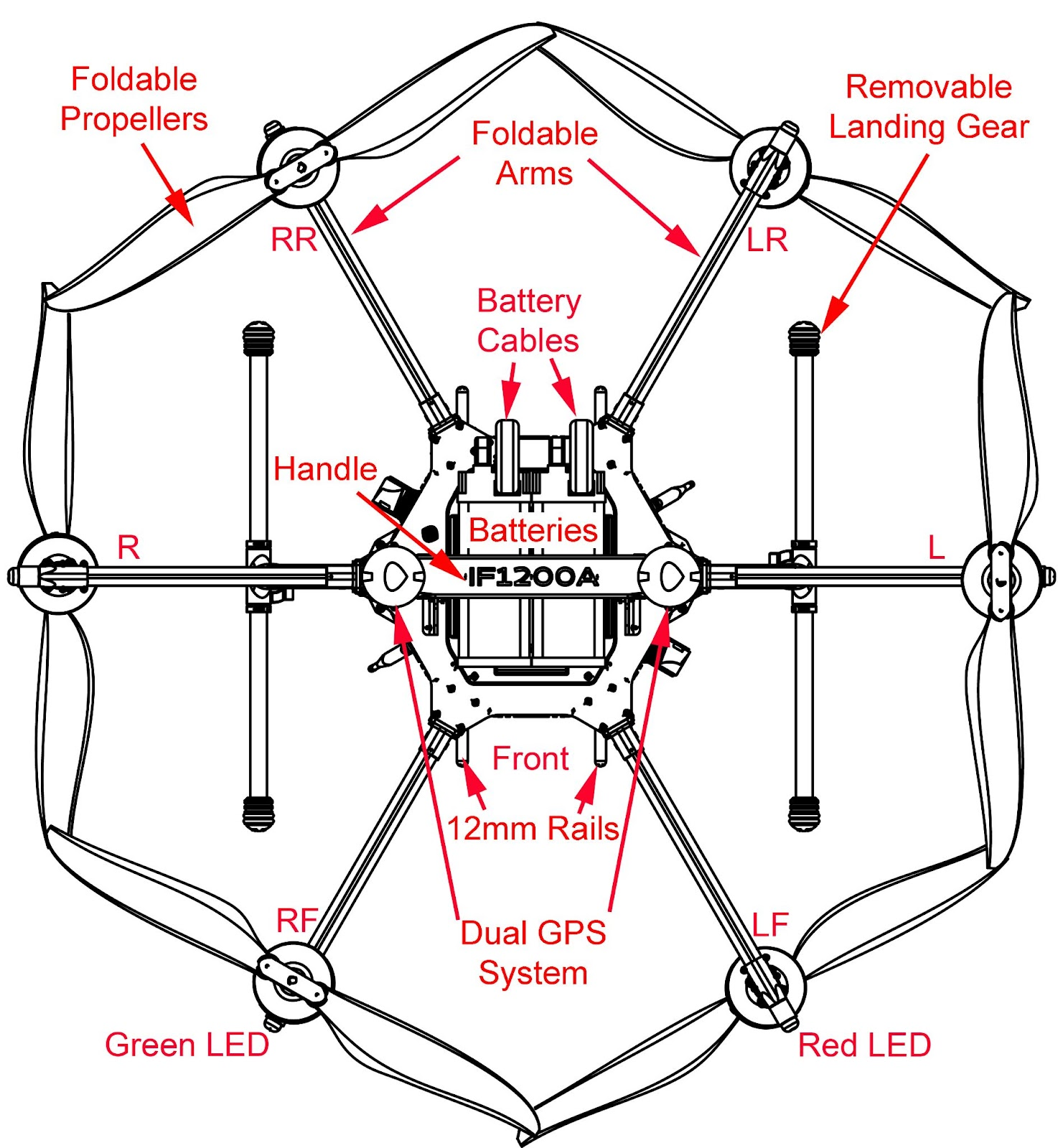 Figures 1 and 2 below provide both a front and top down view of the aircraft including labeled components to help familiarize users with the IF1200A orientation.