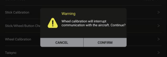 *Note: When Stick/Wheel/Button Check is selected, the following warning will appear. Communication with the drone will be interrupted. Ensure it is safe before tapping **CONFIRM**. Tap **CANCEL** to return to the settings menu.*&#x20;