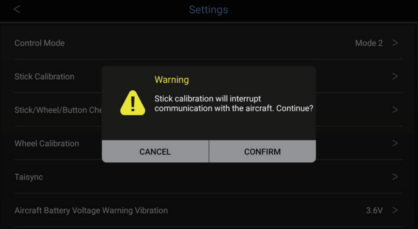 When “Stick Calibration” is selected, the following warning will&#x20;appear. Communication with the drone will be interrupted. Ensure it is safe&#x20;before tapping **CONFIRM.** Tap **CANCEL** to return to the settings menu.